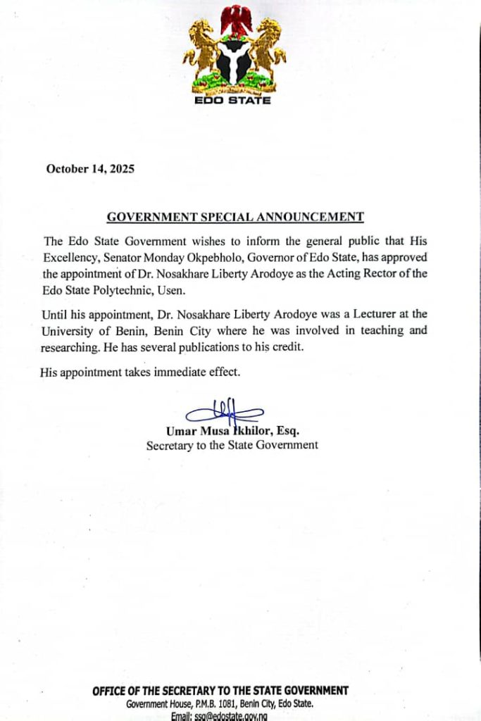 Okpebholo Appoints V.C in Edo University
